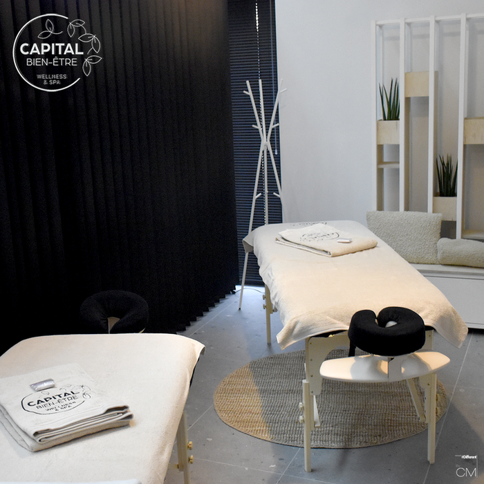 « Une expérience exceptionnelle en couple. Dans notre salle de massage duo, vous êtes installés l'un face à l'autre, tête à tête d'une séance de massage qui se fait en simultané par 2 masseuses. Un moment de détente en duo..."